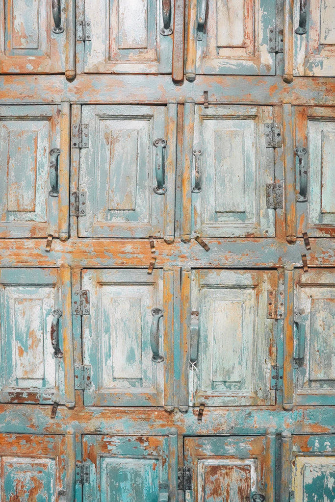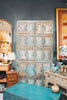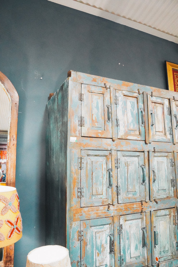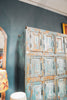 This vintage cabinet is pure artistry — featuring a grid of hand-carved doors with distressed turquoise and ochre patina that whispers stories of time and craftsmanship. Each weathered layer reveals hints of its history, blending natural wood tones with aged teal and soft cream for that effortlessly bohemian appeal.
