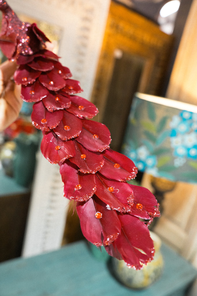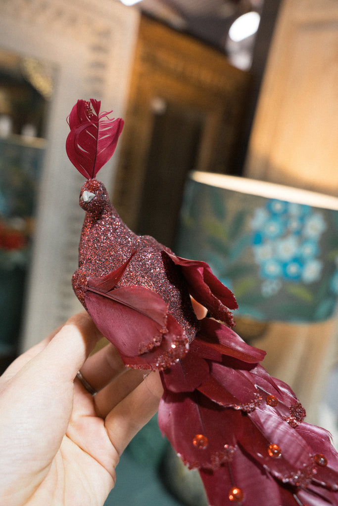Unleash a little Christmas magic with our whimsical Red Peacock Long Tail decoration. Featuring red glitter and real feathers, this beautiful peacock is sure to add a touch of sparkle and enchantment to your holiday decor. Makes for a quirky and playful addition to any Christmas tree.