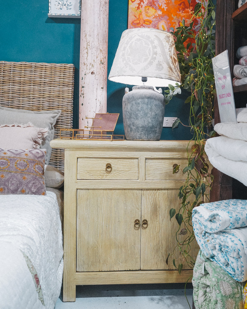 The Citrine Cabinet is a stylish pale wood sideboard measuring 1 meter long, 44 cm wide, and 88 cm high. Featuring two doors and two drawers, it offers versatile storage to keep your space organized and clutter-free. Its sleek design adds a touch of natural elegance, making it perfect as a side table or storage solution in any room. Elevate your home with this functional and attractive piece that combines quality craftsmanship with practical style.
