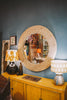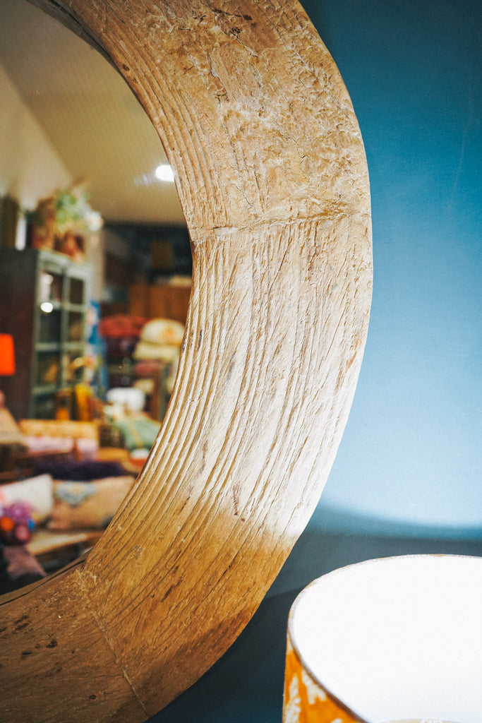 Stunning and bold circular mirror wth a wooden frame. Perfect for indoor or outdoor.